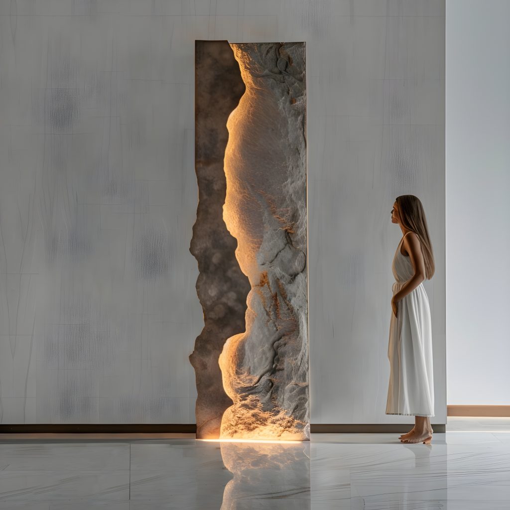 Inspired by the eroded banks of ancient rivers, Totem River stands as a vertical poem in stone and light. Its sculpted surface evokes the organic textures formed by centuries of flowing water—soft curves, sedimentary layers, and the sacred imprint of time.